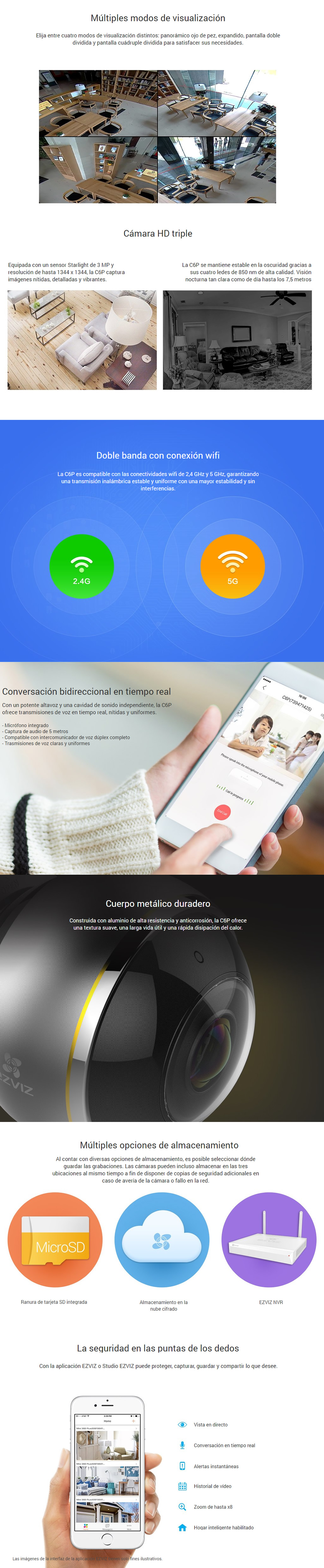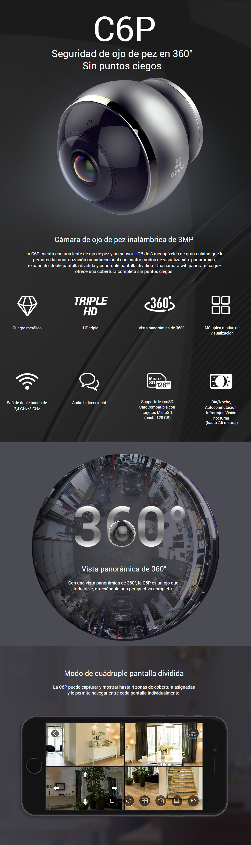 La C6P cuenta con una lente de ojo de pez y un sensor HDR de 3 megapíxeles de gran calidad que le permiten la monitorización omnidireccional con cuatro modos de visualización: panorámico, expandido, doble pantalla dividida y cuádruple pantalla dividida. Una cámara wifi panorámica que ofrece una cobertura completa sin puntos ciegos.